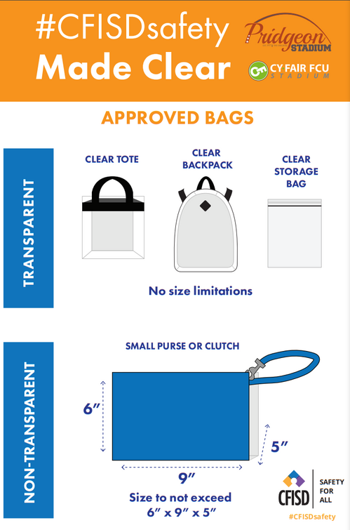 Clear backpacks, clear totes and clear storage bags will be allowed with no size restrictions. Non-transparent purses and bags will be limited to 6” x 9” x 5”. An exception will be made for medically necessary items after proper inspection.